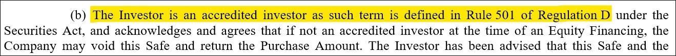 Pursuant to Regulation D of the U.S. Securities Act, a company raising funds via SAFE must obtain a representation regarding the investor’s accredited status (Section 4(b)):