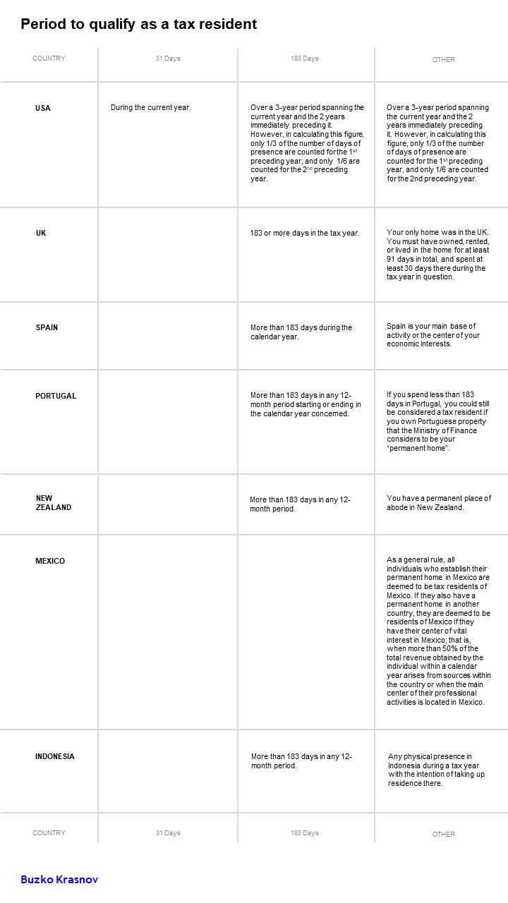 - You don’t become a tax resident in any other country by either (i) overstaying a given time period or (ii) having some other ties with that other country under its local law; and