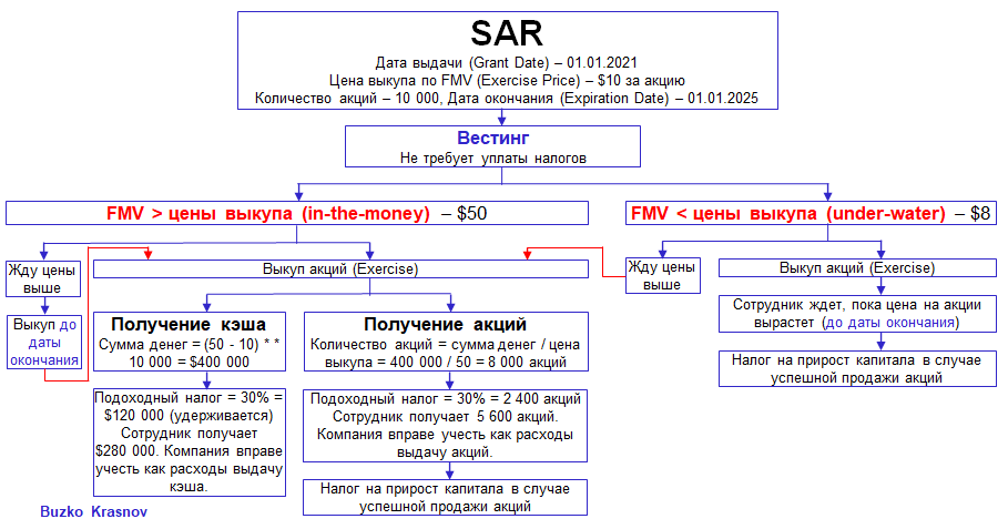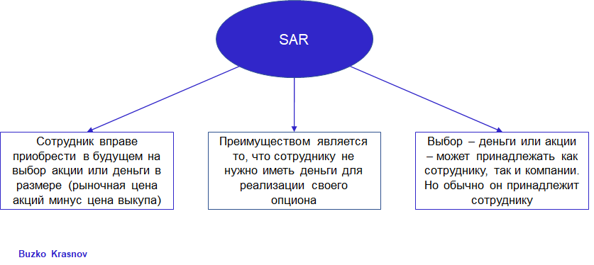 Напоследок можно сказать, что SAR является довольно гибким механизмом и не требует от сотрудника наличия денежных средств для реализации своего опциона. Гибкость является плюсом и для самой компании, равно как и то, что она вправе учесть как расходы выдачу сотруднику денежных средств или стоимость выданных акций, тем самым понизив свою налогооблагаемую прибыль.