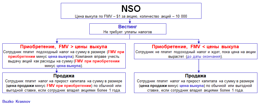 - Не нужно бояться NSO, поскольку налоговыми рисками, связанными с необходимостью уплаты подоходного налога, можно управлять – например, приобретать акции в периоды, когда FMV является достаточно низкой в силу волатильности рынка или иных факторов.