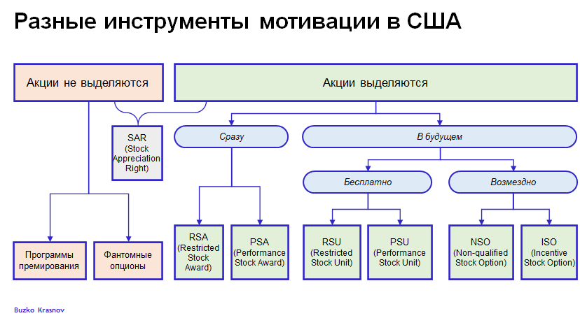 Из схемы видно, что глобально инструменты мотивации подразделяются на те, которые предполагают передачу акций сотруднику, и те, которые передачи акций не предполагают. Поскольку цель данной статьи помочь сотруднику разобраться в тех инструментах, в которых задействована передача ему акций, программы премирования и фантомные опционы детально не анализируются.