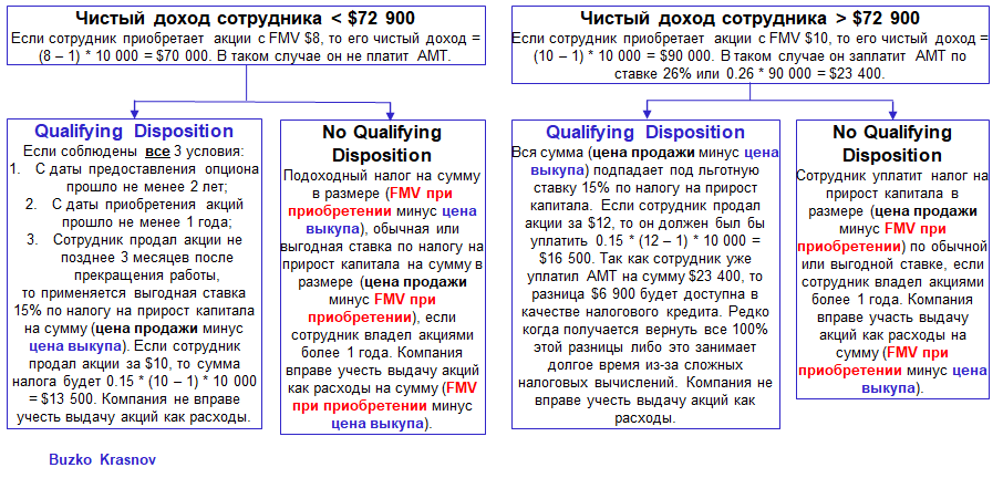 Что это за случаи? Если в результате реализации опциона чистый доход сотрудника (то есть доход за вычетом цены выкупа акций) превышает $72 900, то сотрудник обязан заплатить AMT по определенной ставке в зависимости от этой суммы (чаще всего – 26% или 28%). Также, помимо обложения AMT на федеральном уровне, каждый штат имеет свою ставку, но почти везде она 0% (в Калифорнии – 7%, в Нью-Йорке – 6%).