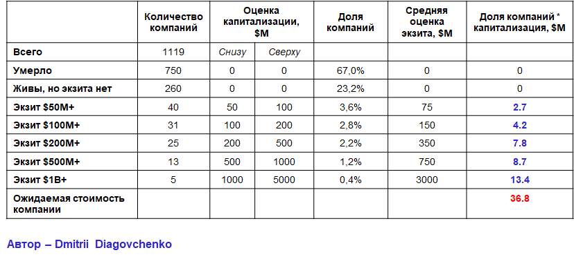 Тем самым можно найти математическую среднюю стоимость стартапа.