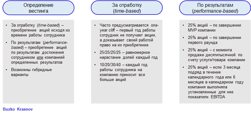 Также часто сотрудник получает акции на условиях вестинга. Вестинг (от англ. “vesting”) – это процесс поэтапного снятия ограничений на приобретение сотрудником акций. Если акции получены сотрудником сразу, то под вестингом стоит понимать процесс поэтапного снятия ограничений на возможность свободного распоряжения акциями.