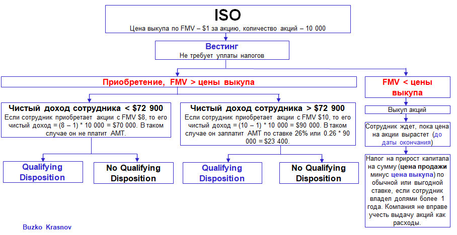 - Именно за счет отсутствия подоходного налога ISO предпочтительнее, но приобретение акций по ISO может влечь уплату AMT, что нивелирует все преимущества такого опциона. Самые существенные налоговые издержки возникают при выходе стартапа на IPO;
