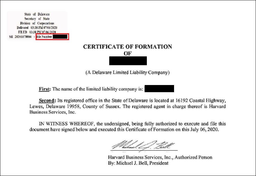 Регистрационный номер компании можно найти в штампе штата на свидетельстве о регистрации (Certificate of Formation) вашей LLC (выделен красным на примере ниже).