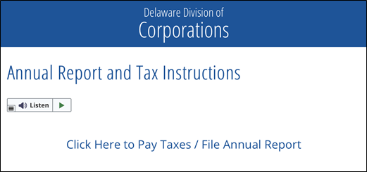 1. Зайдите на сайт https://corp.delaware.gov/paytaxes/ и нажмите на «Click Here to Pay Taxes / File Annual Report».