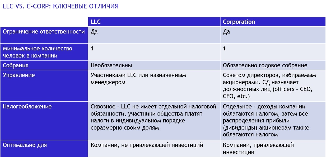 Тем не менее, для операционной компании, которая планирует расширяться и привлекать инвестиции либо проходить через акселераторы, C-Corp будет более подходящим вариантом.
