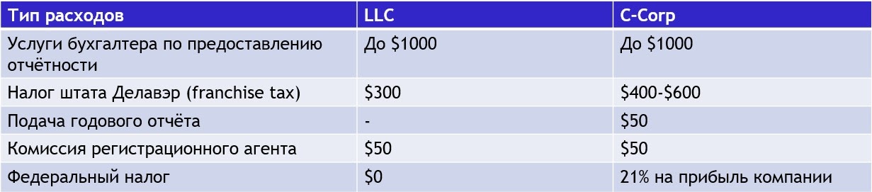 Чтобы запустить компанию на территории США, нужно понести ряд расходов. В таблице указаны основные статьи ежегодных расходов для LLC и C-Corp в штате Делавэр.