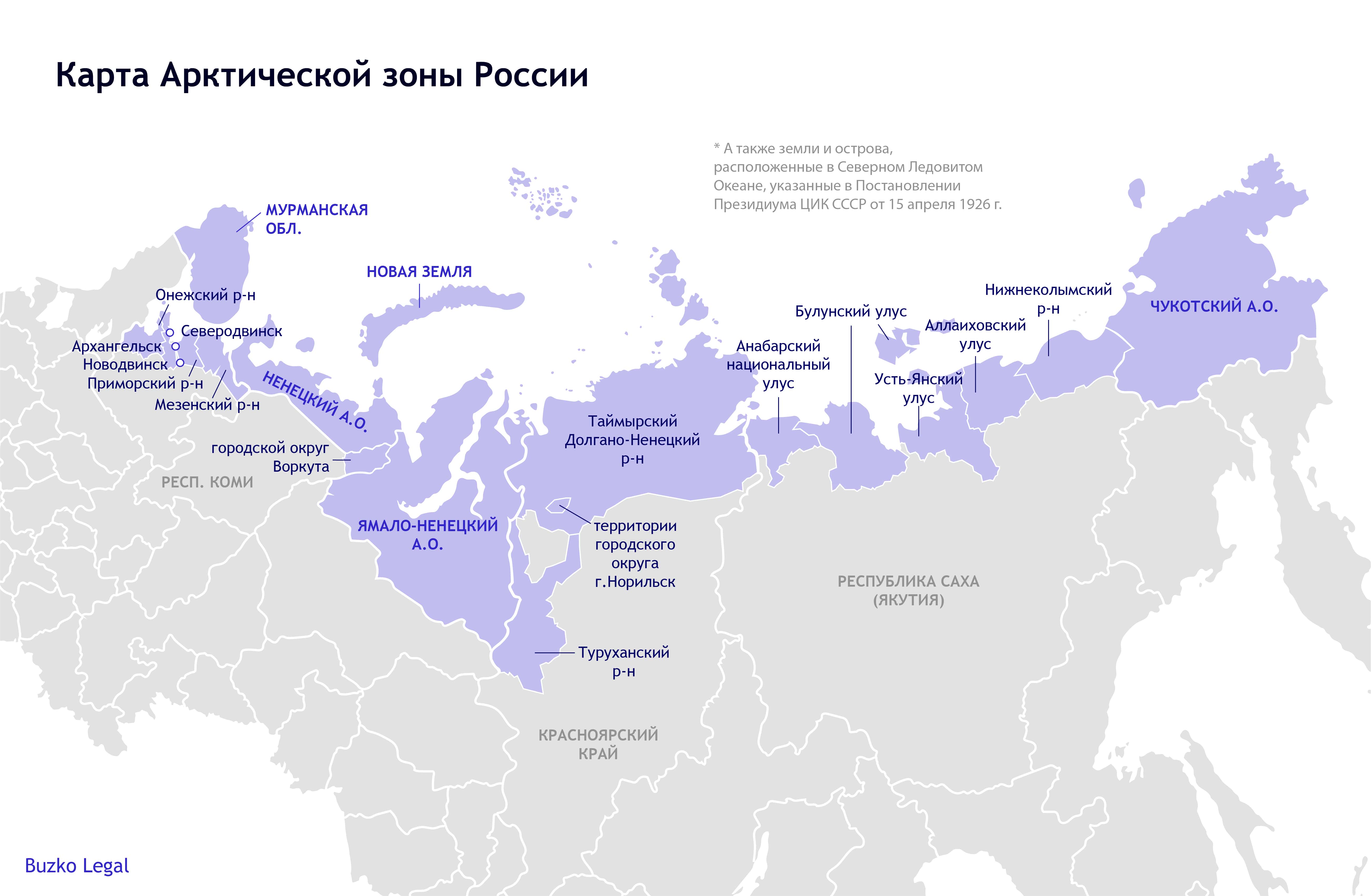 К Арктической зоне относятся обширные территории в Северном Ледовитом океане, а также некоторые субъекты России (Мурманская область, НАО, Чукотка, ЯНАО) и части таких субъектов, как Карелия, Коми, Якутия, Красноярский край, Архангельская область.